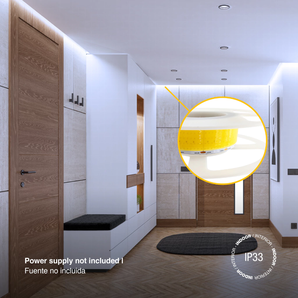 Flujo luminoso alto: Nuestra tira COB de color Blanco Frío (5000-5500K) ofrece 4.400lm por metro y un flujo luminoso total de 22.000 lúmenes, esto, además de un CRI de> 90 Ra, lo hace perfecto para techos, paredes, escaleras, interiores. iluminación y más!