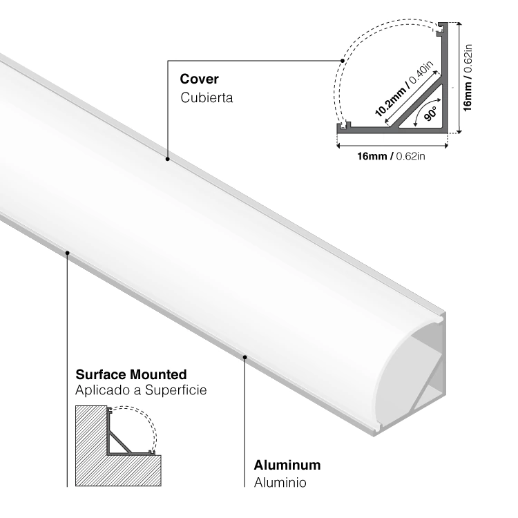 Perfil esquinero de aluminio blanco de 16x16mm, ideal para instalaciones en esquinas a 90°. Su diseño compacto y discreto permite una integración armoniosa en diversos espacios. Incluye un cobertor curvo opal blanco que proporciona una iluminación suave y uniforme, reduciendo el deslumbramiento y ocultando los puntos de luz de la tira LED. El perfil lineal de esquina acepta un ancho de hasta 12 mm, ideal para tiras de LED como las tiras SMD2835, 3528, 5050 y 5630.